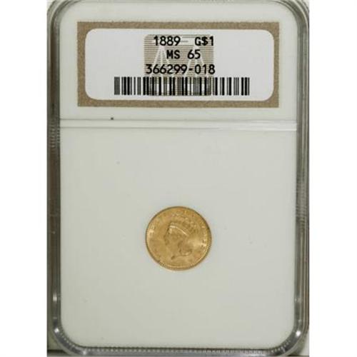 <B>1889 G$1 MS65 NGC.</B></I> Gorgeous, swirling luster and pale lemon-gold surfaces combine to delightful effect on this final-year Gem. Despite a mintage of just 29,000 pieces, the 1889 gold dollar is readily available in Mint State grades, though anything above MS65 can be elusive.<BR><I>From The Florissant Collection.</B></I><BR><BR><B>Coin Engraver:</B> James B. Longacre<BR><BR><b>Shipping:</b> Coins & Currency (<a target="_blank" href="http://www.heritageauctions.com/common/shipping.php">view shipping information</a>)
