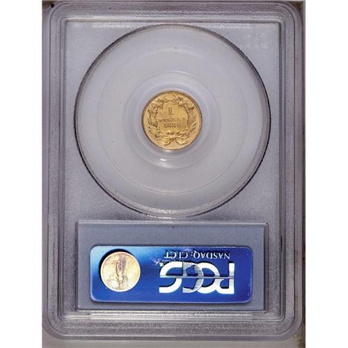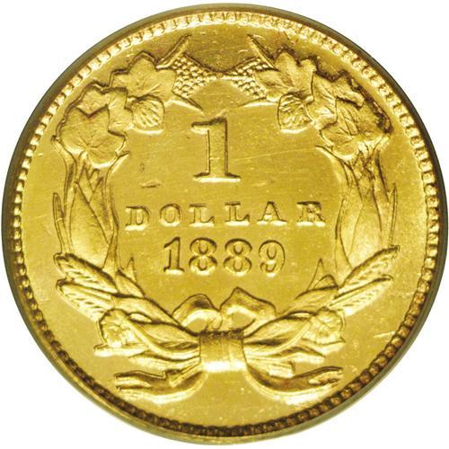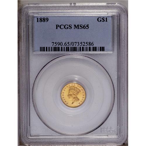 <B>1889<G$1> MS65 PCGS.</B></I> The 1889 is one of the best produced dates in the entire series of gold dollars. It is also one of the most widely saved, undoubtedly because it is the final year of the type. As a result, high grade pieces are relatively easy to find for type purposes. This is an especially pleasing coin that has rich orange-gold coloration and bright, semi-prooflike fields. The striking details are fully defined in all areas and the only mentionable surface defect is a planchet flaw to the left of the 1 in the denomination. <BR><BR><B>Important notice:</B> Heritage usually auctions material at the rate of 200-250 lots per hour. On some occasions eBay Live bid software or the Internet may not be able to keep up with the pace of the auction. We recommend placing a realistic absentee bid now as insurance to avoid disappointment. Occasionally the auctioneer may eliminate or reject an eBay Live bid, and the auctioneer may also reopen a lot after the close of the eBay live bidding (usually because we missed an audience bid), and may reject your bid even if it shows you as the winning bidder. By bidding via eBay Live, you agree that Heritage may award the lot to another bidder at its sole discretion under the circumstances described above or any other reasonable circumstances. Since eBay bids are not shown to us until we open the lot on the floor, we treat those bids just like floor bids. In most cases the floor responds before the eBay bid is presented to us, due to Internet lag time, so for consistency we have made it a policy that floor bids are always considered first over tie eBay live bids. Also please note that all Heritage lots purchased through eBay Live carry a 20% Buyer's Premium. Please make sure you read the Terms and Conditions before you bid. This lot is being auctioned in conjunction with a live floor auction by Heritage Galleries & Auctioneers. All final auction and invoice information will be supplied by Heritage Galleries & Auctioneers, and all other information should be considered preliminary. Lot:2326 <BR><BR><B>Winning Notification and Billing:</B> After the FINAL session in this auction is complete, Heritage will send e-mail and snail mail invoices. This process normally takes several days. All final auction and invoice information will be supplied by Heritage Galleries & Auctioneers, and all other information should be considered preliminary. <BR><BR>This auction will be conducted on a live auction floor and over the Internet through eBay Live. If you choose to place an absentee bid, please take a moment to <font color='#0000ff'><u><a href='http://pages.ebay.com/liveauctions/help/before/laabsentee.html'>learn how eBay Live absentee bidding works</a></u></font><font color='#000000'>