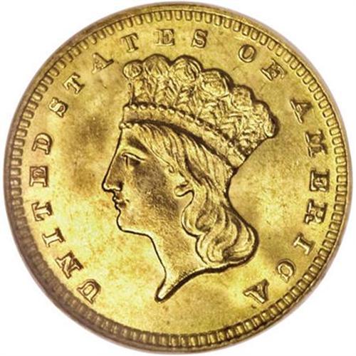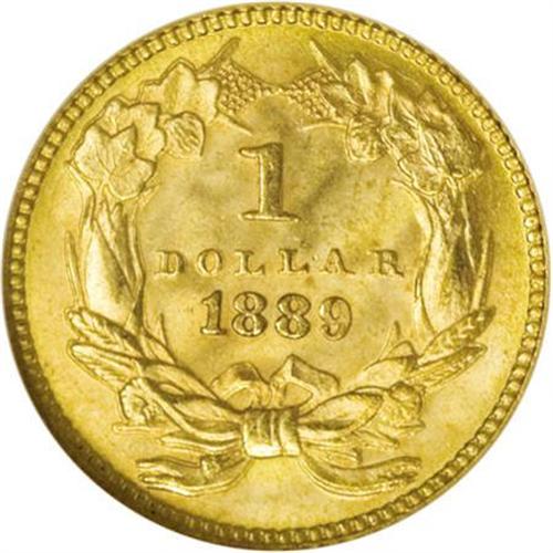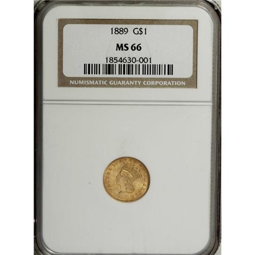 <B>1889 G$1 MS66 NGC.</B></I> Final year of issue and always a popular coin as such. This fully struck example has thick, conspicuous mint luster that gives the coin much of its visual appeal, along with deep, beautiful tangerine-gold coloration. A hair fine die crack runs from four o'clock to ten o'clock on the reverse, and the reverse is rotated approximately 15 degrees counterclockwise.<BR><BR><b>Shipping:</b> Coin/Currency (<a target="_blank" href="http://www.heritageauctions.com/common/shipping.php">view shipping information</a>)