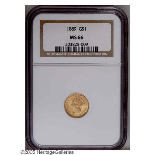 <B>1889<G$1> MS66 NGC.</B></I> Great luster exudes from brassy-gold surfaces that are imbued with traces of lime-green, and the design features are exceptionally well defined. There are no mentionable marks to report. The reverse is rotated a few degrees.