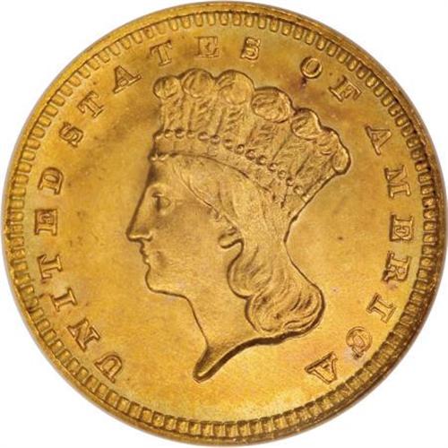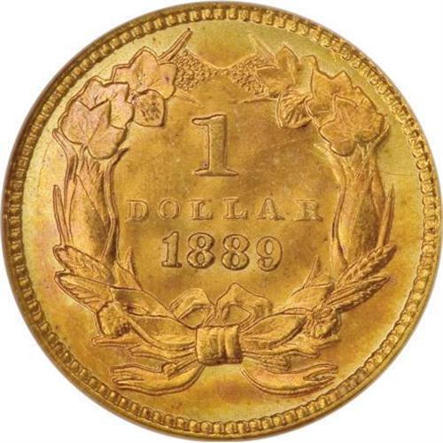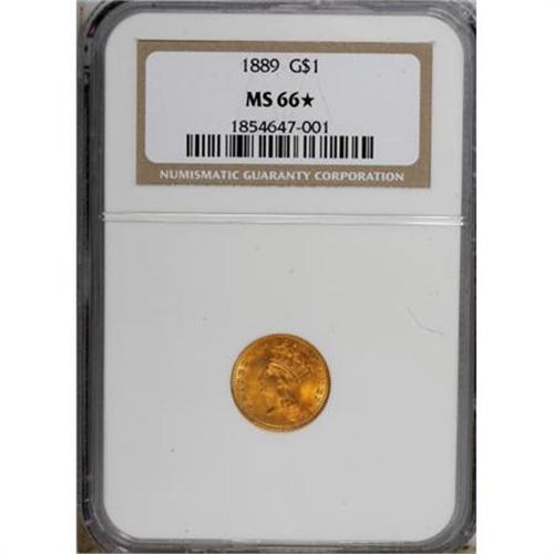 <B>1889 G$1 MS66 <img border='0' src='http://www.heritagecoins.com/images/star.gif' width=10 height=10> NGC.</B></I> Despite the relatively low 28,950-piece business strike mintage, 1889 gold dollars are readily found in any grade. Jeff Garrett and Ron Guth (2006) point out that small hoards have turned up with regularity over the years. They also suggest that the date's high survival rate is probably due to its status as the last year of the type and the end of gold dollars in general.<BR> Outstanding luster enlivens both sides, each of which displays rich reddish-gold, orange, and mint-green coloration on frosty surfaces. A powerful strike emboldens all of the design features, including virtually full delineation on the intricacies of the reverse wreath. An inoffensive handling mark or two precludes an even higher grade. The coin's overall eye appeal is breathtaking!<BR><BR><b>Shipping:</b> Coins & Currency (<a target="_blank" href="http://www.heritageauctions.com/common/shipping.php">view shipping information</a>)