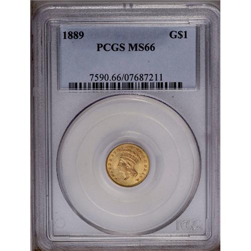 <B>1889<G$1> MS66 PCGS.</B></I> An enchanting high-end type coin that has flashy, reflective fields and virtually no marks. Pretty pink-orange and mint-green toning adorns each side. Final year of issue for the denomination and always a popular choice for type purposes.