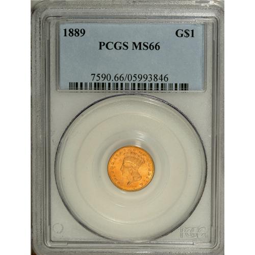 <B>1889 G$1 MS66 PCGS.</B></I> The Act of September 26, 1890, closed the book on not just the gold dollar, but the three dollar gold piece and the three cent nickel as well. Many examples of those series were saved from the previous year, which makes them more available for collectors today. This honey-gold piece is one such example, highly lustrous with pleasing detail. Hardly any flaws affect the shining surfaces.<BR><BR><b>Shipping:</b> Coin/Currency (<a target="_blank" href="http://www.heritageauctions.com/common/shipping.php">view shipping information</a>)