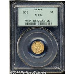 <B>1889<G$1> MS66 PCGS.</B></I> Sharply struck and highly lustrous, with plenty of cartwheel effects to be seen, this Gem exhibits an interesting number of striking elements, including: a slender die crack, which travels along the left reverse rim and die polish lines on the obverse, between the I and the C of AMERICA. All of these features were present before the coin left the mint, and should not be considered for grading purposes. A small dark alloy spot, under the A of STATES, and on the reverse under the date are mentioned for the sake of accuracy. That said, this is a full Gem with splendid eye appeal, and premium quality at the current grade.<BR><I>From The Greenwich Collection, Part One.</B></I> <BR><BR><B>Important notice:</B> Heritage usually auctions material at the rate of 200-250 lots per hour. On some occasions eBay Live bid software or the Internet may not be able to keep up with the pace of the auction. We recommend placing a realistic absentee bid now as insurance to avoid disappointment. Occasionally the auctioneer may eliminate or reject an eBay Live bid, and the auctioneer may also reopen a lot after the close of the eBay live bidding (usually because we missed an audience bid), and may reject your bid even if it shows you as the winning bidder. By bidding via eBay Live, you agree that Heritage may award the lot to another bidder at its sole discretion under the circumstances described above or any other reasonable circumstances. Since eBay bids are not shown to us until we open the lot on the floor, we treat those bids just like floor bids. In most cases the floor responds before the eBay bid is presented to us, due to Internet lag time, so for consistency we have made it a policy that floor bids are always considered first over tie eBay live bids. Also please note that all Heritage lots purchased through eBay Live carry a 20% Buyer's Premium. Please make sure you read the Terms and Conditions before you bid.