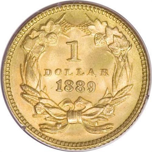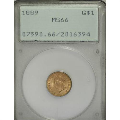 <B>1889 G$1 MS66 PCGS.</B></I> The last year of gold dollar mintage, represented by a delightful khaki-gold example with radiant luster and frosty surfaces.<I> </B></I>This coin shows bold strike doubling at the lower reverse, throughout the bow and lower wreath. Certified in an early small-size holder.<BR><BR><B>Coin Engraver:</B> James B. Longacre<BR><BR><b>Shipping:</b> Coins & Currency (<a target="_blank" href="http://www.heritageauctions.com/common/shipping.php">view shipping information</a>)