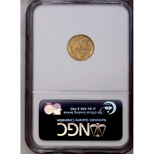 <B>1889<G$1> MS67 NGC.</B></I> Survivors of this issue, the last gold dollar struck for circulation, are often seen in the highest grades. The present example is just such a coin with virtually flawless surfaces, frosty luster, and brilliant yellow-gold color. The reverse has a few tiny blemishes inside the wreath. As the gold dollar was phased out, with a production of 29,000 coins in 1889, few entered the channels of commerce in the late 19th century, thus there is a preponderance of Choice and Gem Mint State examples in numismatic circulation today.