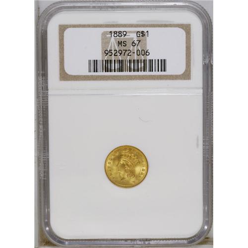 <B>1889 G$1 MS67 NGC.</B></I> This magnificent gold type coin has beautiful honey and lime toning, and the shimmering surfaces are virtually void of contact. The strike is exacting, and the eye appeal is formidable. Typical of business strikes of this final issue, the wreath ribbon is die doubled south.<BR><BR><b>Shipping:</b> Coins & Currency (<a target="_blank" href="http://www.heritageauctions.com/common/shipping.php">view shipping information</a>)