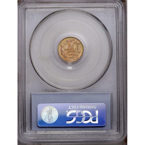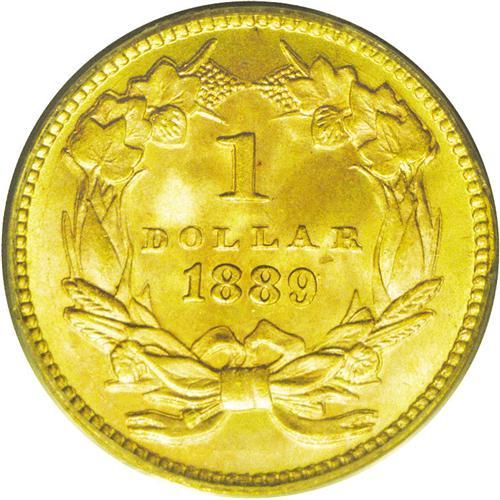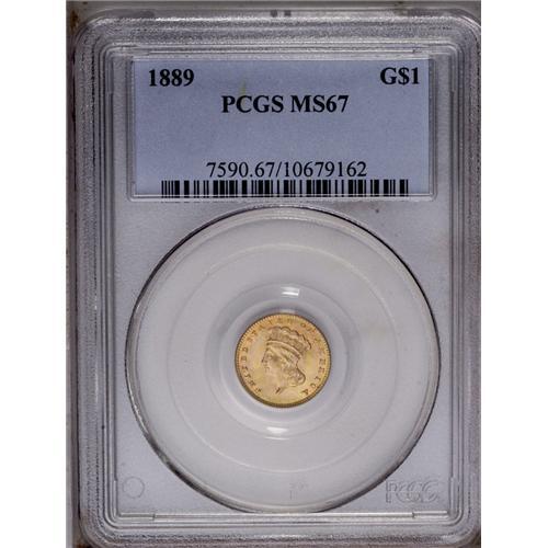 <B>1889<G$1> MS67 PCGS.</B></I> A gorgeous Superb Gem that has a needle-sharp strike and virtually pristine surfaces with abundant orange-peach and green-golden color. Potent luster embraces each side. The reverse periphery has a few lengthy and faint die cracks. While the final issue of the gold dollar is not a rarity despite a low production of 28,950 pieces, few of the survivors can match the outstanding quality of this coin.