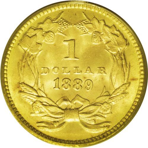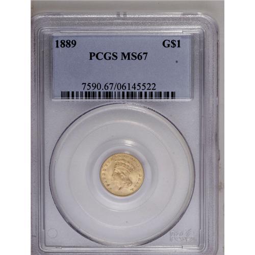 <B>1889<G$1> MS67 PCGS.</B></I> Flashy Superb Gems such as the present example were set aside by farsighted collectors as examples from the final year of issue for the type. This piece has choice medium-gold surfaces with brilliant luster and virtually no evidence of contact. A couple of tiny dark toning spots appear under a glass, but they are undistracting. PCGS has graded only a single example finer (6/06).