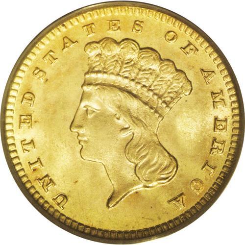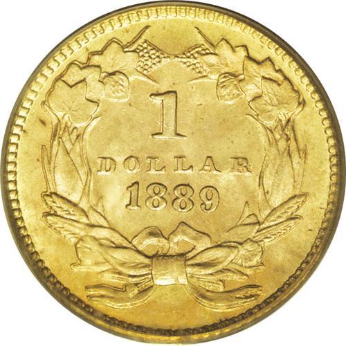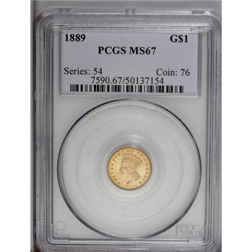 <B>1889<G$1> MS67 PCGS.</B></I> From the final year of issue comes this magnificent Superb Gem. A wonderfully detailed coin with fresh, original luster and great eye appeal. A tiny copper spot near 9 o'clock on the reverse rim is the only noticeable flaw on the carrot-gold surfaces, and PCGS has certified only one coin finer (7/06).