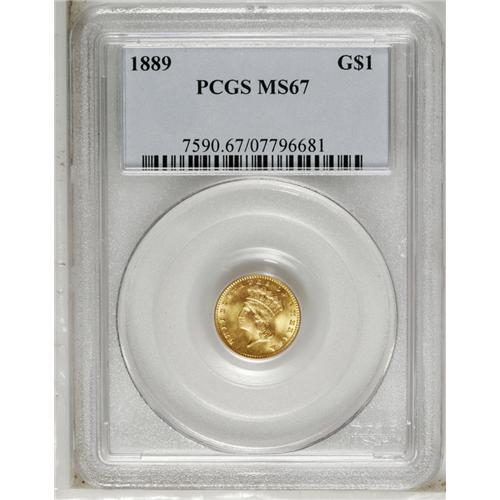 <B>1889<G$1> MS67 PCGS.</B></I> Final year of issue and always a popular coin as such. This fully struck example has thick, coruscating mint luster that gives the coin much of its visual appeal, along with deep, beautiful champagne-gold coloration. Exemplary quality such as this is always appreciated, regardless of the type. PCGS has graded just one piece finer (7/06). <BR><BR><B>Importan