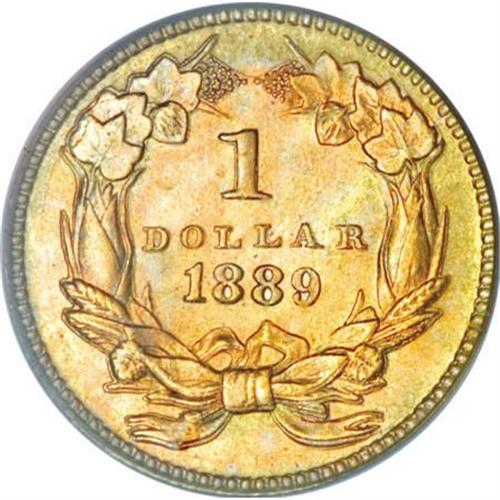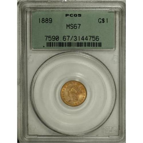 <B>1889 G$1 MS67 PCGS.</B></I> This breathtaking Superb Gem exhibits dazzling luster radiating from orange-gold and mint-green surfaces, and a solid strike imparts virtual completeness to the design elements. Close examination reveals impeccably preserved surfaces. Housed in a green-label holder.<BR><BR><B>Coin Engraver:</B> James B. Longacre<BR><BR><b>Shipping:</b> Coins & Currency (<a target="_blank" href="http://www.heritageauctions.com/common/shipping.php">view shipping information</a>)