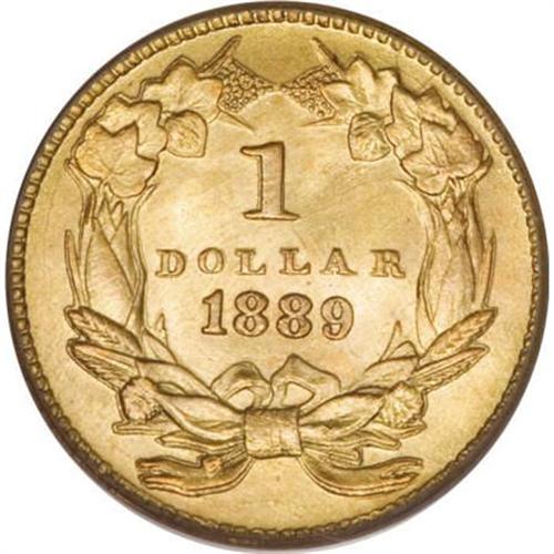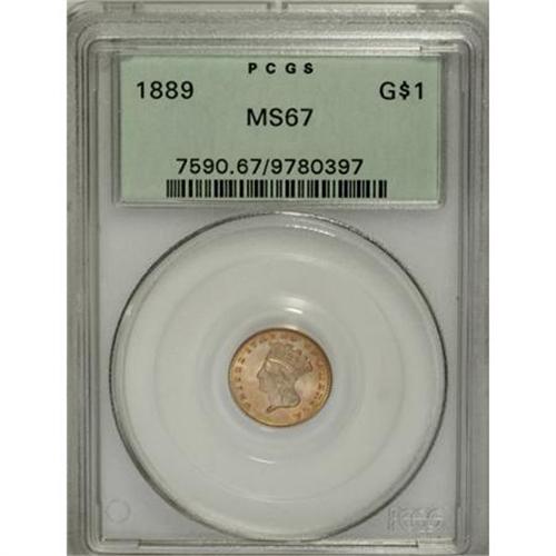 <B>1889 G$1 MS67 PCGS.</B></I> A wonderful Superb Gem of this date, also showing bold strike doubling at the lower reverse. The lustrous surfaces show an interesting mix of hazel-gray and deep orange-red coloration, with no visible distractions on this final-year gold dollar issue. Certified in a green-label holder.<BR><BR><B>Coin Engraver:</B> James B. Longacre<BR><BR><b>Shipping:</b> Coins & Currency (<a target="_blank" href="http://www.heritageauctions.com/common/shipping.php">view shipping information</a>)