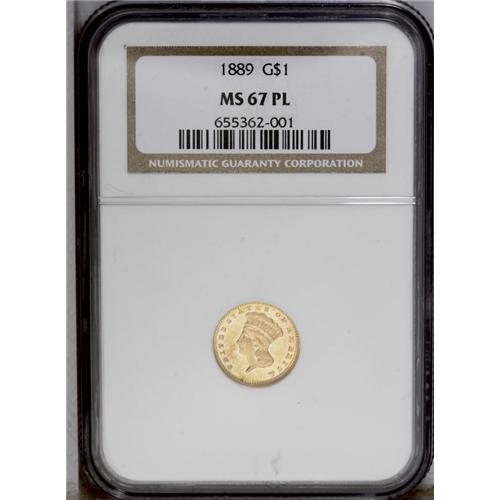 <B>1889<G$1> MS67 Prooflike NGC.</B></I> Widely saved as the final year of the denomination, this is an especially attractive survivor. The surfaces show pronounced yellow-gold centers with deep orange-gold peripheral color. The fields are sparkling and prooflike, but lack the depth of a proof striking. Fully struck on each side, there are a couple of tiny field marks on the reverse but these do no detract from the overall aesthetic appeal of this Superb type coin. <BR><BR><B>Important notice:</B> Heritage usually auctions material at the rate of 200-250 lots per hour. On some occasions eBay Live bid software or the Internet may not be able to keep up with the pace of the auction. We recommend placing a realistic absentee bid now as insurance to avoid disappointment. Occasionally the auctioneer may eliminate or reject an eBay Live bid, and the auctioneer may also reopen a lot after the close of the eBay live bidding (usually because we missed an audience bid), and may reject your bid even if it shows you as the winning bidder. By bidding via eBay Live, you agree that Heritage may award the lot to another bidder at its sole discretion under the circumstances described above or any other reasonable circumstances. Since eBay bids are not shown to us until we open the lot on the floor, we treat those bids just like floor bids. In most cases the floor responds before the eBay bid is presented to us, due to Internet lag time, so for consistency we have made it a policy that floor bids are always considered first over tie eBay live bids. Also please note that all Heritage lots purchased through eBay Live carry a 20% Buyer's Premium. Please make sure you read the Terms and Conditions before you bid. This lot is being auctioned in conjunction with a live floor auction by Heritage Galleries & Auctioneers. All final auction and invoice information will be supplied by Heritage Galleries & Auctioneers, and all other information should be considered preliminary. Lot:2330 <BR><BR><B>Winning Notification and Billing:</B> After the FINAL session in this auction is complete, Heritage will send e-mail and snail mail invoices. This process normally takes several days. All final auction and invoice information will be supplied by Heritage Galleries & Auctioneers, and all other information should be considered preliminary. <BR><BR>This auction will be conducted on a live auction floor and over the Internet through eBay Live. If you choose to place an absentee bid, please take a moment to <font color='#0000ff'><u><a href='http://pages.ebay.com/liveauctions/help/before/laabsentee.html'>learn how eBay Live absentee bidding works</a></u></font><font color='#000000'>