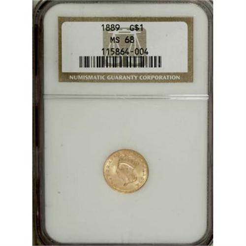 <B>1889 G$1 MS68 NGC.</B></I> Even the most discerning collector cannot help but admire the near-perfection of this frosty straw-gold piece. The luster is fresh and original, and the strike is bold. A practically undisturbed and wonderful piece that could find a place in an uncommonly fine type or date set. Census: 15 in 68, 0 finer (6/07). <BR><BR><B>Coin Engraver:</B> James B. Longacre<BR><BR><b>Shipping:</b> Coins & Currency (<a target="_blank" href="http://www.heritageauctions.com/common/shipping.php">view shipping information</a>\)