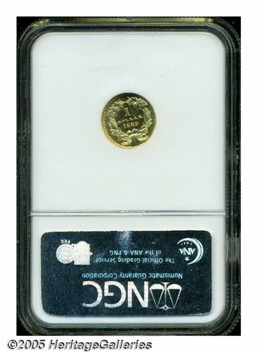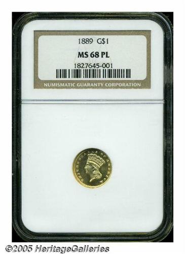 <B>1889<G$1> MS68 Prooflike NGC.</B></I> A glittering prooflike jewel that is virtually impossible to improve upon. For whatever reason, the Gold Dollars of the 1880s were made as nicely as any coins ever minted by our government. Coupled with the fact that a number of these little gems were set aside by collectors and well preserved over the years, collectors now have the opportunity to buy a visually stunning piece of numismatic art. This is the single finest prooflike example thus far certified by NGC (12/04).