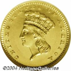 <B>1889<G$1> PR63 Cameo NGC.</B></I> An eye-catching proof with strong contrast between the frosty devices and the deep, dripping wet mirrored fields. A horizontal pinscratch from the D of UNITED to Liberty's forehead is mentioned for accuracy. Die polishing has removed leftmost details of the crown. The dies are rotated by about 30 degrees counterclockwise. Only 1,779 Gold Dollars were minted in proof format in 1889, which was the final year of the series. <BR><BR><B>Important notice:</B> Heritage usually auctions material at the rate of 200-250 lots per hour. On some occasions eBay Live bid software or the Internet may not be able to keep up with the pace of the auction. We recommend placing a realistic absentee bid now as insurance to avoid disappointment. Occasionally the auctioneer may eliminate or reject an eBay Live bid, and the auctioneer may also reopen a lot after the close of the eBay live bidding (usually because we missed an audience bid), and may reject your bid even if it shows you as the winning bidder. By bidding via eBay Live, you agree that Heritage may award the lot to another bidder at its sole discretion under the circumstances described above or any other reasonable circumstances. Since eBay bids are not shown to us until we open the lot on the floor, we treat those bids just like floor bids. In most cases the floor responds before the eBay bid is presented to us, due to Internet lag time, so for consistency we have made it a policy that floor bids are always considered first over tie eBay live bids. Also please note that all Heritage lots purchased through eBay Live carry a 20% Buyer's Premium. Please make sure you read the Terms and Conditions before you bid. </span></font></tr></table></td></tr></table>