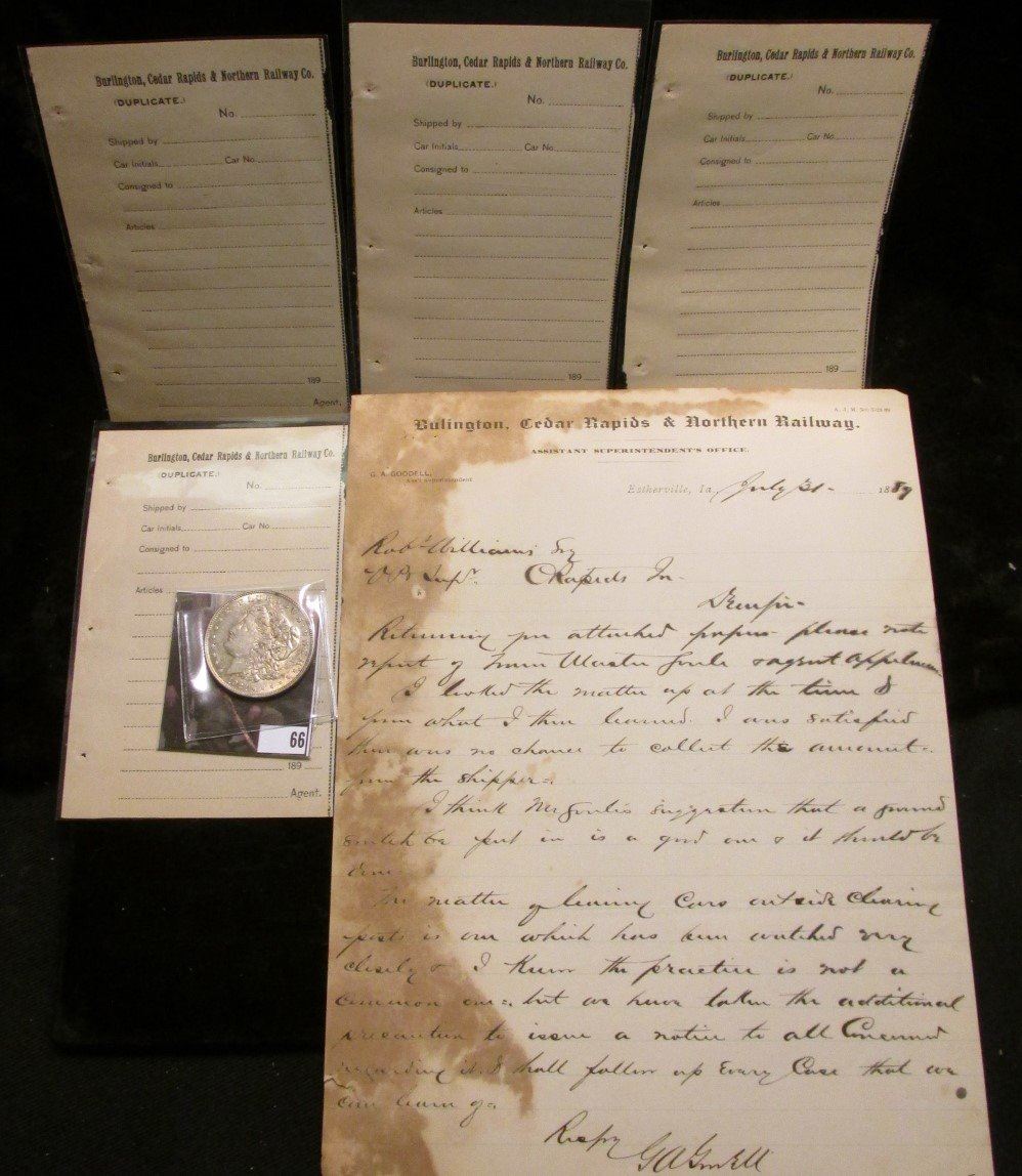 1889 Letter of Correspondence on stationery from "Burlington, Cedr Rapids & Northern Railway Assistant Superintendent's Office" & a 1921 P U.S. Silver Morgan Dollar.