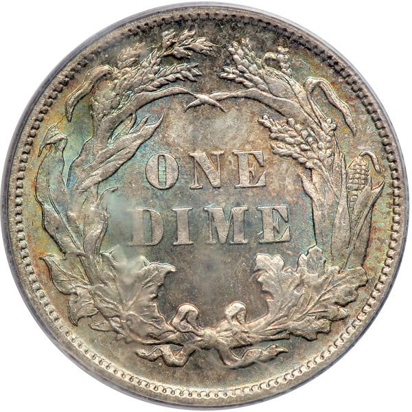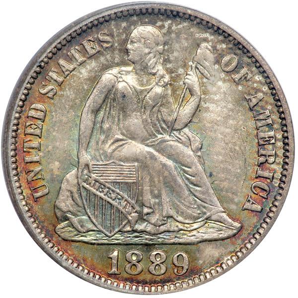 1889 DDR FS-801. PCGS graded MS-66 CAC Approved. FS-005.3. Double Die Reverse. Lovely multi-color toning. The doubling is most notable on the left side of the wreath where the edges are show clear ghost images. Rare. Pop 1, the only Mint State DDR example graded at PCGS (PCGS # 145504) .