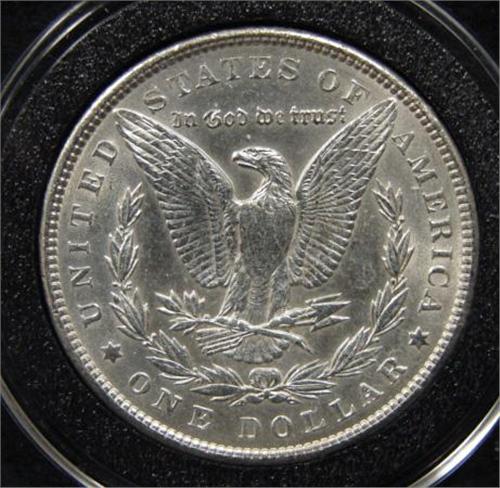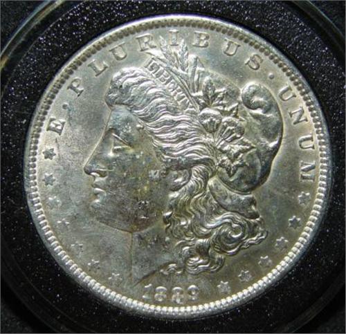 1889 U.S. MORGAN SILVER DOLLAR. Coin is in circular case.