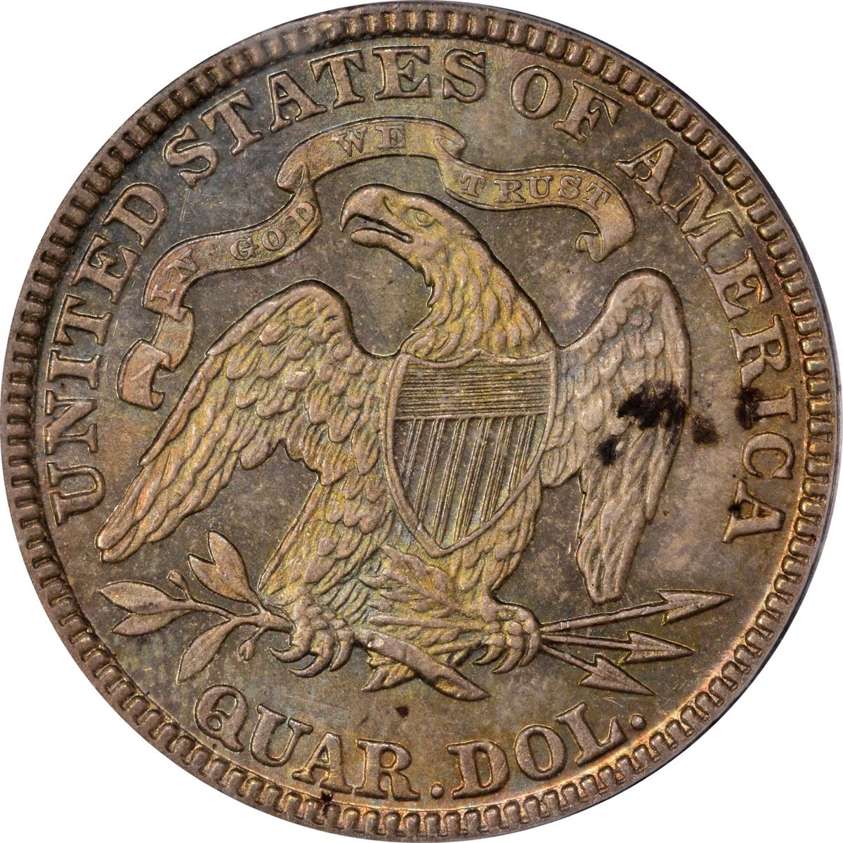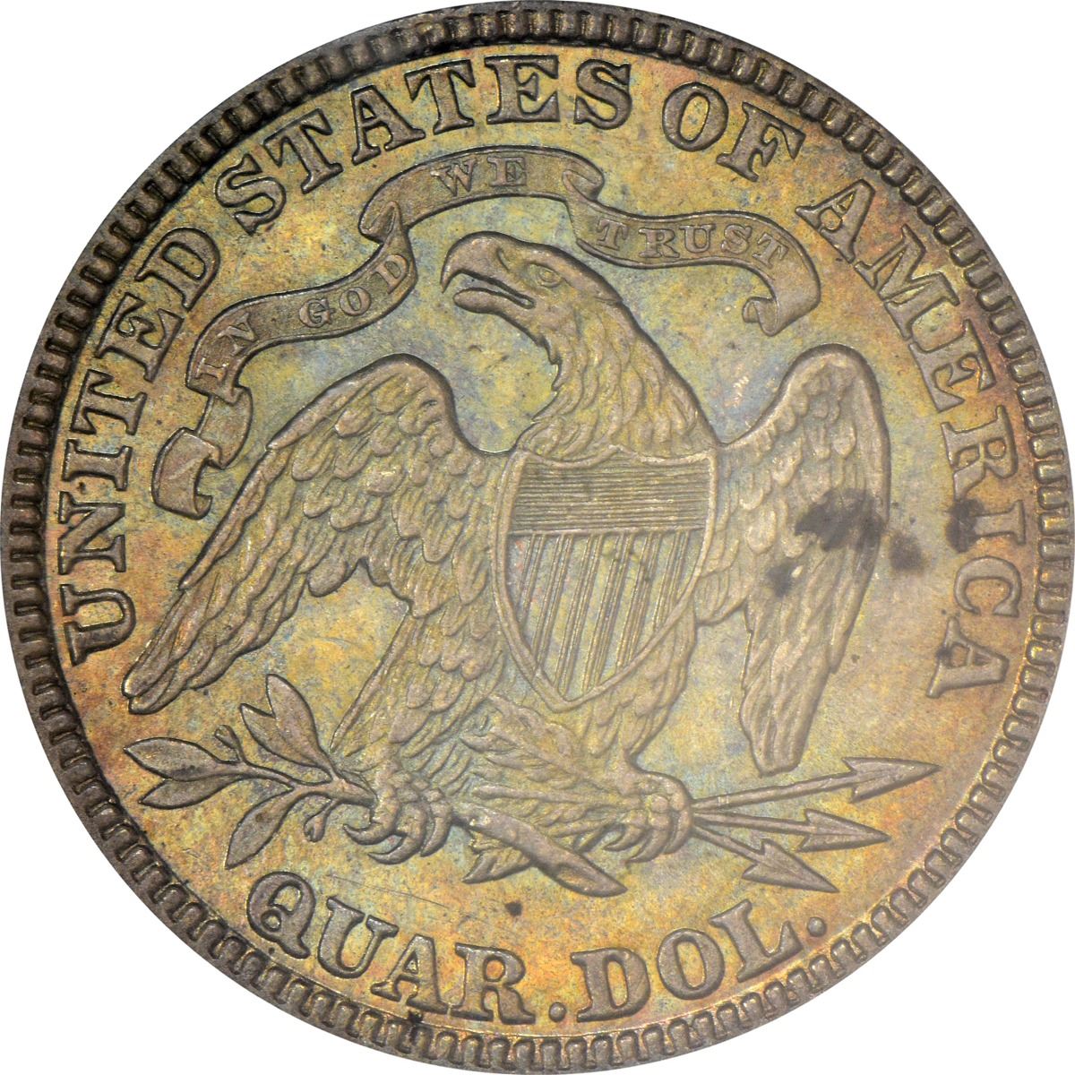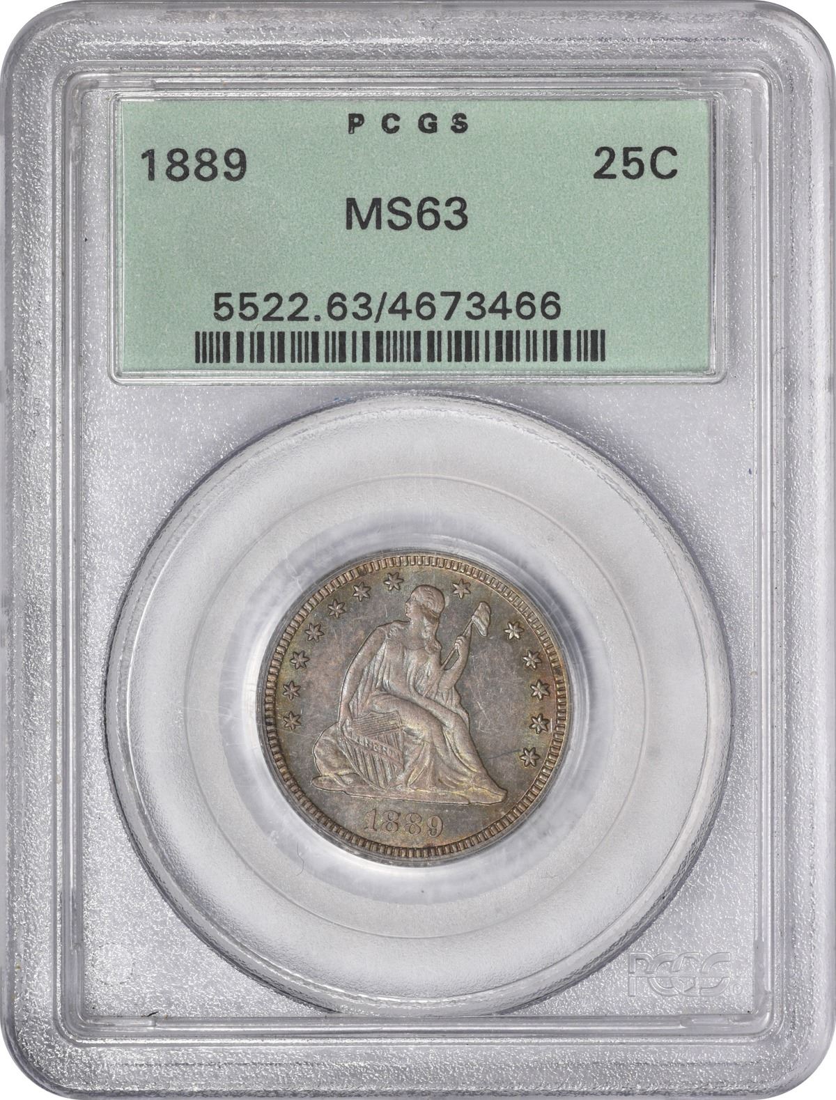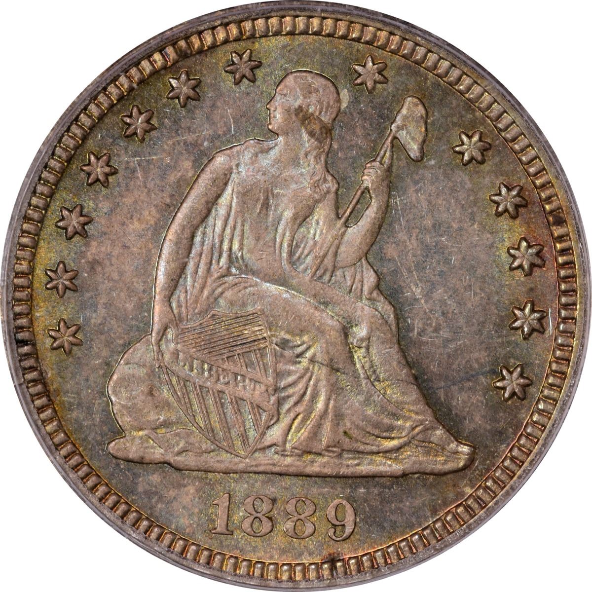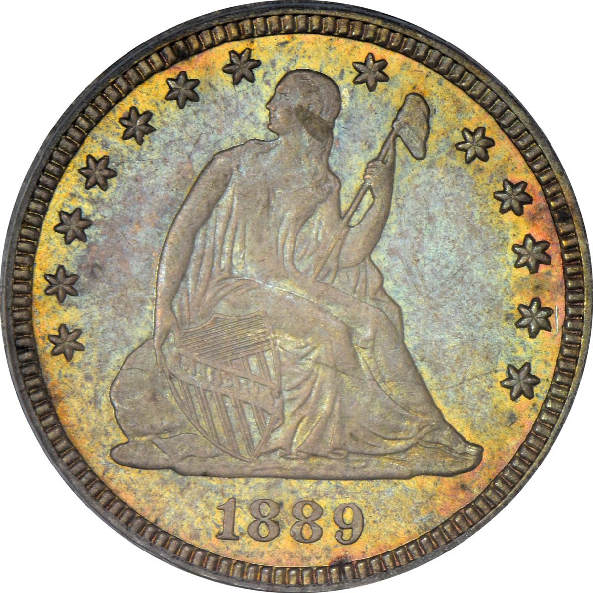 The satiny lilac-gray surfaces relinquish lively cartwheel luster beneath their lovely peach and powder-blue iridescent highlights. One of just 12,000 examples of the date struck in a long procession of Philadelphia Mint issues from 1879 through 1888 and again in 1889 and 1890 that had small mintages. (More than 1.2 million quarters dates 1888-S were struck and represented the first branch mint issue in the denomination since 1878.) Sharply struck. We note some reverse toning spots at the 3 o’clock position. PCGS #5522