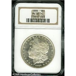 <B>1889<img border='0' src='http://www.heritagecoins.com/images/star.gif' width=10 height=10>$1 MS65 Prooflike NGC.</B></I> Sharply struck, with speckles of milky color. Some minute luster grazes on Liberty's cheek and neck are not bothersome. Population: 25 in 65, 2 finer (1/05). Lot:10285