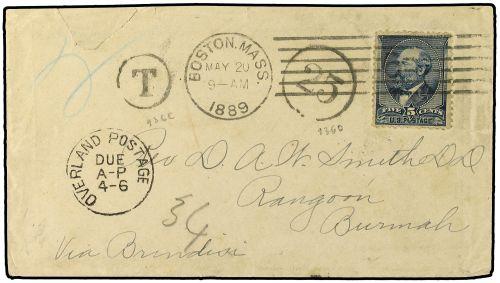 1889 (May 20) Cover from Boston to Rangoon, Burma bearing Garfield 5 c. blue, underpaid for this destination with ´T´ and ´25´ markings in circle and ´Overland Postage Due´ on front. Reverse with ´Sea Post Office/B´ cds (June 6) and Rangoon arrival. A very scarce destination. Scott 216.