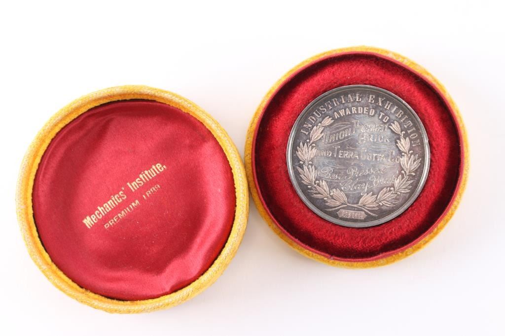Reads: Industrial Exhibition awarded to Union Pressed Brick and Terra Cotta Co, Best Pressed Clay Brick 1889. Appears to be silver, in original velvet lined display box.