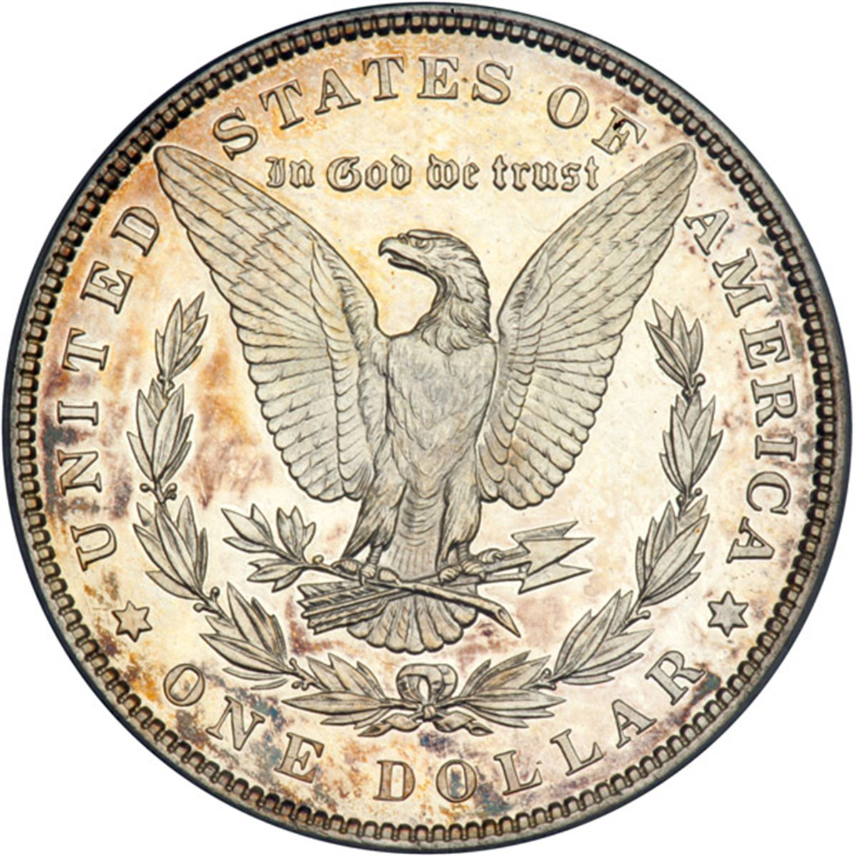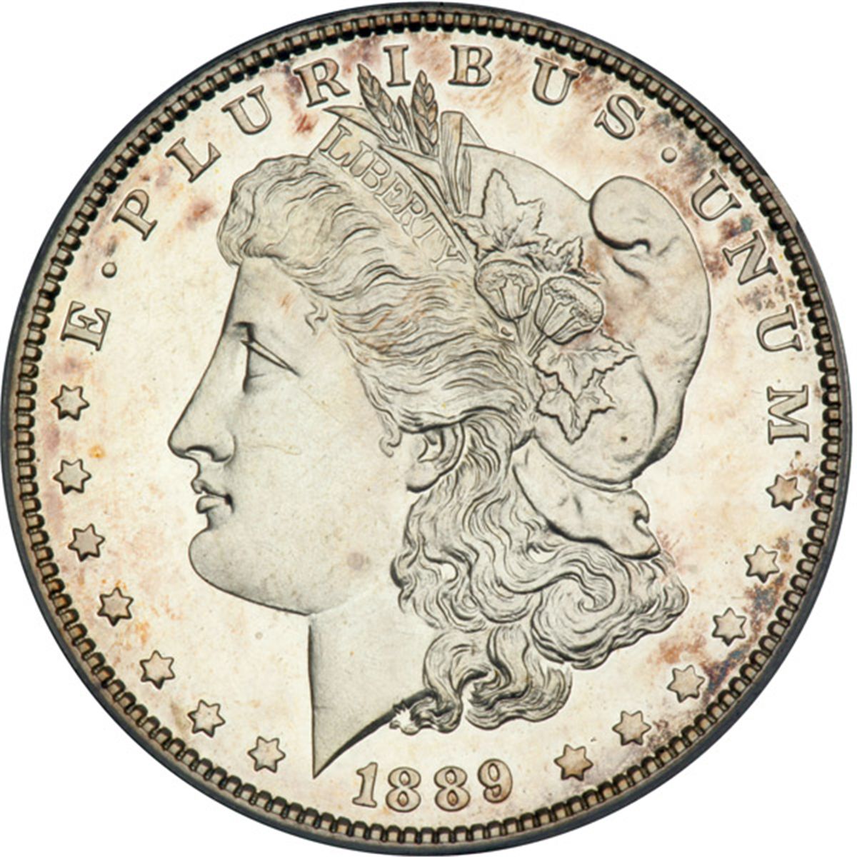 1889 Morgan Dollar. Proof 64+ Cameo. CAC Approved. A gorgeous brilliant white cameo example with hints of light tone starting to form. Although one might assume the deeply reflective mirrors would be the dominant feature on this handsome Proof, what immediately transfixes the viewer's attention is the splendid frosted cameo sheen off the devices. Very scarce in such attractive condition. Only 811 Proofs struck. Pop 2; 3 finer in 65+ (PCGS # 87324) .