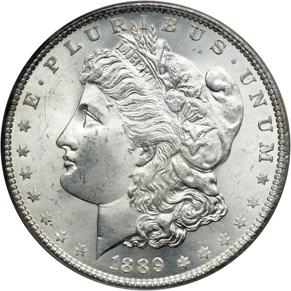1889 Morgan Dollar. PCGS graded MS-65. House in an Old Green Holder. Frosty and white (PCGS # 7188) .