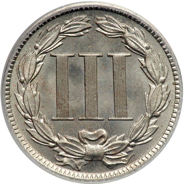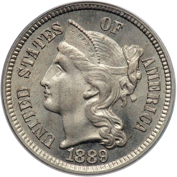 1889 Nickel Three Cents. PCGS graded Proof 64. Lightly toned (PCGS # 3786) .