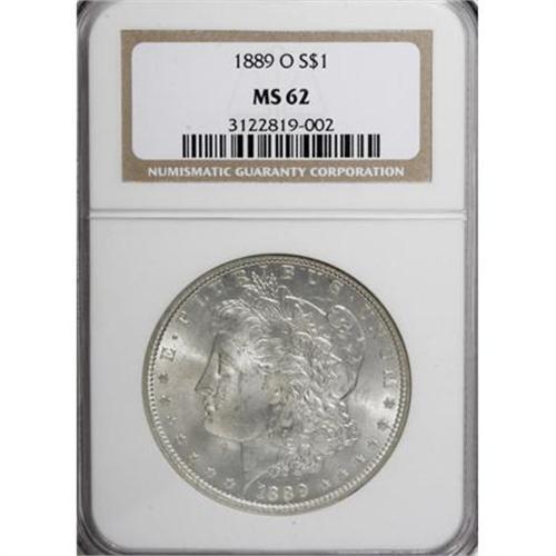 <B>1889-O $1 MS62 NGC.</B></I> NGC Census: (540/1946). PCGS Population (918/2984). Mintage: 11,875,000. Numismedia Wsl. Price for NGC/PCGS coin in MS62: $179. (#7192)<BR><BR><B>Coin Engraver:</B> George T. Morgan<BR><BR><b>Shipping:</b> Coins & Currency (<a target="_blank" href="http://www.heritageauctions.com/common/shipping.php">view shipping information</a>)