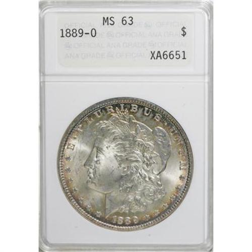 <B>1889-O $1 MS63 ANACS.</B></I> NGC Census: (1103/837). PCGS Population (1600/1357). Mintage: 11,875,000. Numismedia Wsl. Price for NGC/PCGS coin in MS63: $350. (#7192)<BR><BR><B>Coin Engraver:</B> George T. Morgan<BR><BR><b>Shipping:</b> Coins & Currency (<a target="_blank" href="http://www.heritageauctions.com/common/shipping.php">view shipping information</a>)
