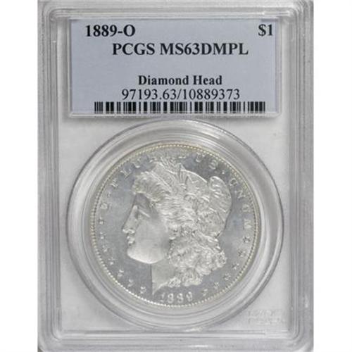 <B>1889-O $1 MS63 Deep Mirror Prooflike PCGS.</B></I> Ex: Diamond Head Collection. This example is well struck and untoned, with flashy, prooflike fields and lightly frosted devices. Shallow blemishes in the left obverse field and a handful of parallel slide marks across Liberty's cheekbone account for the grade. Population: 32 in 63 Deep Mirror Prooflike, 19 finer (6/07). <BR><I>From the Diamond Head Registry Set of Prooflike Dollars.</B></I><BR><BR><b>Shipping:</b> Coins & Currency (<a target="_blank" href="http://www.heritageauctions.com/common/shipping.php">view shipping information</a>)