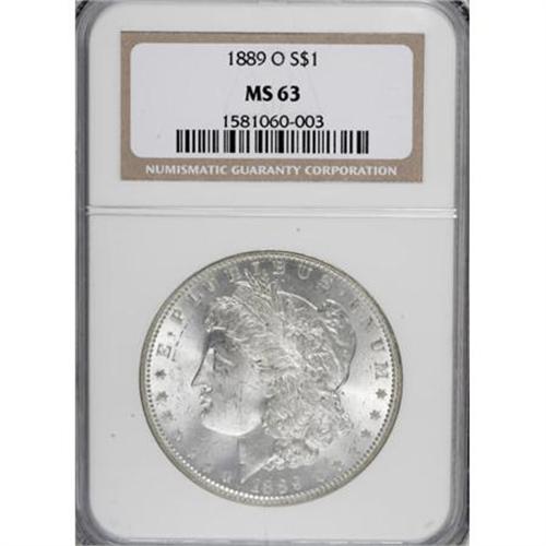 <B>1889-O $1 MS63 NGC.</B></I> NGC Census: (1076/812). PCGS Population (1538/1286). Mintage: 11,875,000. Numismedia Wsl. Price for NGC/PCGS coin in MS63: $350. (#7192)<BR><BR><B>Coin Engraver:</B> George T. Morgan<BR><BR><b>Shipping:</b> Coins & Currency (<a target="_blank" href="http://www.heritageauctions.com/common/shipping.php">view shipping information</a>)