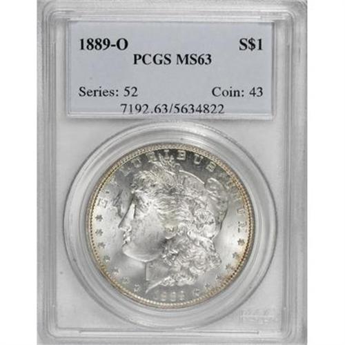 <B>1889-O $1 MS63 PCGS.</B></I> PCGS Population (1538/1286). NGC Census: (1076/812). Mintage: 11,875,000. Numismedia Wsl. Price for NGC/PCGS coin in MS63: $350. (#7192)<BR><BR><B>Coin Engraver:</B> George T. Morgan<BR><BR><b>Shipping:</b> Coins & Currency (<a target="_blank" href="http://www.heritageauctions.com/common/shipping.php">view shipping information</a>)