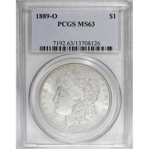 <B>1889-O $1 MS63 PCGS.</B></I> PCGS Population (1573/1321). NGC Census: (1091/828). Mintage: 11,875,000. Numismedia Wsl. Price for NGC/PCGS coin in MS63: $350. (#7192)<BR><BR><B>Coin Engraver:</B> George T. Morgan<BR><BR><b>Shipping:</b> Coins & Currency (<a target="_blank" href="http://www.heritageauctions.com/common/shipping.php">view shipping information</a>)