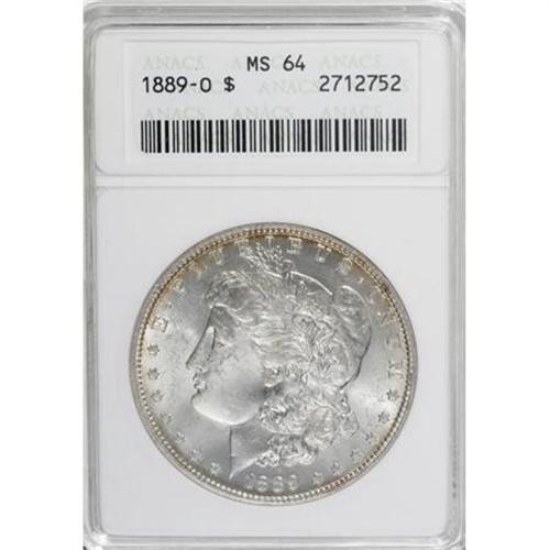 <B>1889-O $1 MS64 ANACS.</B></I> NGC Census: (761/50). PCGS Population (1132/124). Mintage: 11,875,000. Numismedia Wsl. Price for NGC/PCGS coin in MS64: $585. (#7192)<BR><BR><B>Coin Engraver:</B> George T. Morgan<BR><BR><b>Shipping:</b> Coins & Currency (<a target="_blank" href="http://www.heritageauctions.com/common/shipping.php">view shipping information</a>\)
