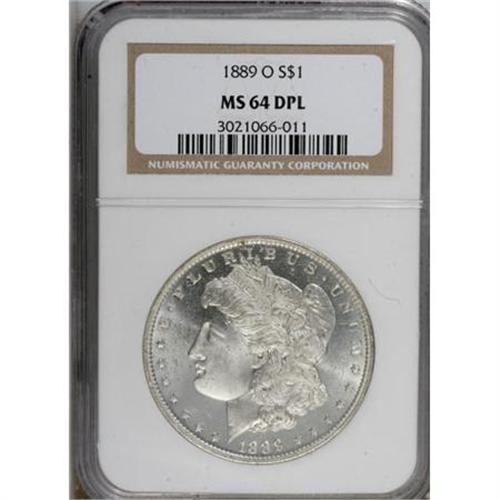 <B>1889-O $1 MS64 Deep Mirror Prooflike NGC.</B></I> A remarkable and unusual near-Gem that has deeply reflective surfaces far removed from the flat and unimpressive luster that so often characterizes this issue. Modest frost graces the well struck devices, and a small spot of rose toning near 12 o'clock on the obverse rim is the only color on the coin. Census: 9 in 64, 4 finer (9/07).<BR><BR><b>Shipping:</b> Coins & Currency (<a target="_blank" href="http://www.heritageauctions.com/common/shipping.php">view shipping information</a>)