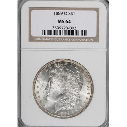 <B>1889-O $1 MS64 NGC.</B></I> NGC Census: (762/50). PCGS Population (1152/132). Mintage: 11,875,000. Numismedia Wsl. Price for NGC/PCGS coin in MS64: $585. (#7192)<BR><BR><B>Coin Engraver:</B> George T. Morgan<BR><BR><b>Shipping:</b> Coins & Currency (<a target="_blank" href="http://www.heritageauctions.com/common/shipping.php">view shipping information</a>)