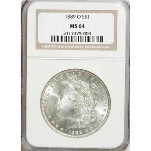 <B>1889-O $1 MS64 NGC.</B></I> NGC Census: (776/50). PCGS Population (1181/138). Mintage: 11,875,000. Numismedia Wsl. Price for NGC/PCGS coin in MS64: $585. (#7192)<BR><BR><B>Coin Engraver:</B> George T. Morgan<BR><BR><b>Shipping:</b> Coins & Currency (<a target="_blank" href="http://www.heritageauctions.com/common/shipping.php">view shipping information</a>)