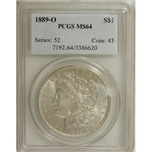 <B>1889-O $1 MS64 PCGS.</B></I> PCGS Population (1152/132). NGC Census: (762/50). Mintage: 11,875,000. Numismedia Wsl. Price for NGC/PCGS coin in MS64: $585. (#7192)<BR><BR><B>Coin Engraver:</B> George T. Morgan<BR><BR><b>Shipping:</b> Coins & Currency (<a target="_blank" href="http://www.heritageauctions.com/common/shipping.php">view shipping information</a>)