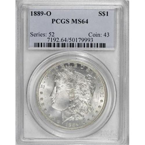 <B>1889-O $1 MS64 PCGS.</B></I> PCGS Population (1153/133). NGC Census: (762/50). Mintage: 11,875,000. Numismedia Wsl. Price for NGC/PCGS coin in MS64: $585. (#7192)<BR><BR><B>Coin Engraver:</B> George T. Morgan<BR><BR><b>Shipping:</b> Coins & Currency (<a target="_blank" href="http://www.heritageauctions.com/common/shipping.php">view shipping information</a>)