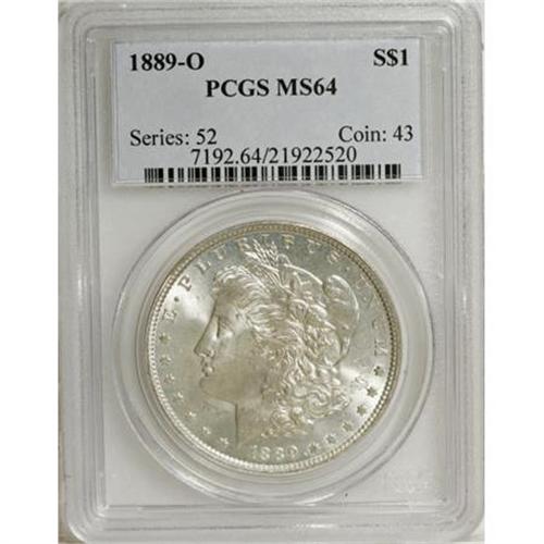 <B>1889-O $1 MS64 PCGS.</B></I> Most of the design elements are well defined, although typical softness is noted over the centers. The silver-gray surfaces are free of toning and only lightly abraded. <BR><BR><B>Coin Engraver:</B> George T. Morgan<BR><BR><b>Shipping:</b> Coins & Currency (<a target="_blank" href="http://www.heritageauctions.com/common/shipping.php">view shipping information</a>)