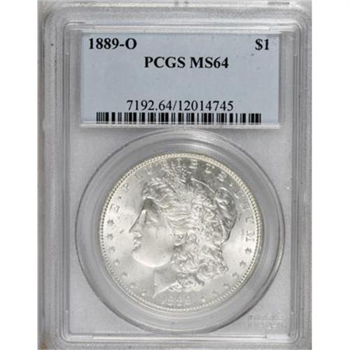 <B>1889-O $1 MS64 PCGS.</B></I> An impressive near-Gem, fully brilliant with satiny mint luster and above average details for this issue. Like many New Orleans issues, the population increased dramatically when the Treasury Hoard appeared in the 1960s.<BR><BR><B>Coin Engraver:</B> George T. Morgan<BR><BR><b>Shipping:</b> Coins & Currency (<a target="_blank" href="http://www.heritageauctions.com/common/shipping.php">view shipping information</a>)