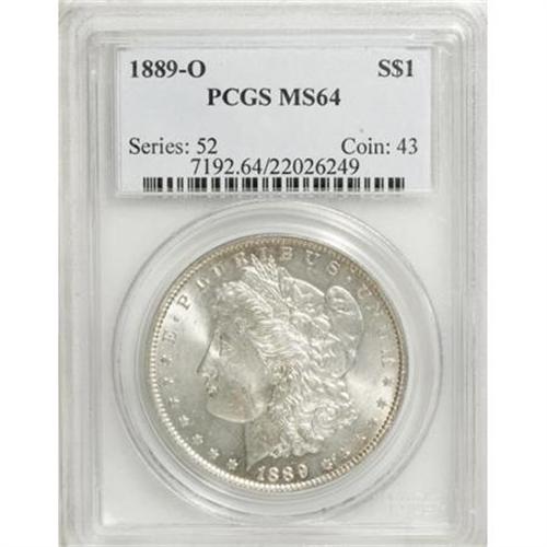 <B>1889-O $1 MS64 PCGS.</B></I> PCGS Population (1185/139). NGC Census: (779/50). Mintage: 11,875,000. Numismedia Wsl. Price for NGC/PCGS coin in MS64: $620. (#7192)<BR><BR><B>Coin Engraver:</B> George T. Morgan<BR><BR><b>Shipping:</b> Coins & Currency (<a target="_blank" href="http://www.heritageauctions.com/common/shipping.php">view shipping information</a>)