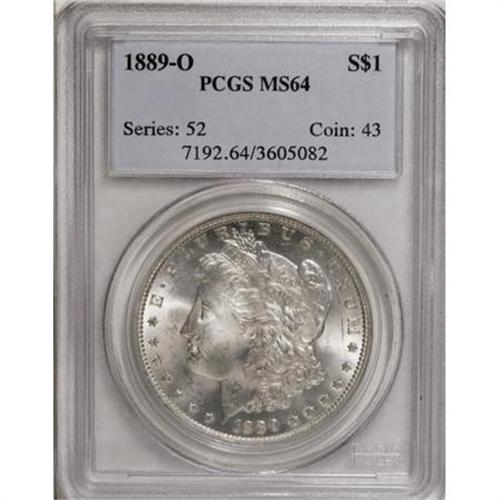 <B>1889-O $1 MS64 PCGS.</B></I> Although the date is usually available in MS64 quality, it is elusive any finer than the present piece. The surfaces are fully brilliant with sharp design features everywhere except over the ear.<BR><BR><B>Coin Engraver:</B> George T. Morgan<BR><BR><b>Shipping:</b> Coins & Currency (<a target="_blank" href="http://www.heritageauctions.com/common/shipping.php">view shipping information</a>)