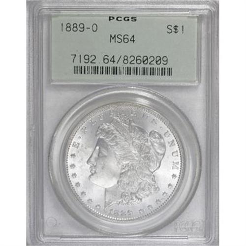 <B>1889-O $1 MS64 PCGS.</B></I> This lustrous near-Gem displays light green-gold toning, and the strike is sharp for an O-mint issue. The reverse is splendidly smooth, and the obverse has only faint luster grazes. Certified in an old green label holder.<BR><BR><B>Coin Engraver:</B> George T. Morgan<BR><BR><b>Shipping:</b> Coins & Currency (<a target="_blank" href="http://www.heritageauctions.com/common/shipping.php">view shipping information</a>)