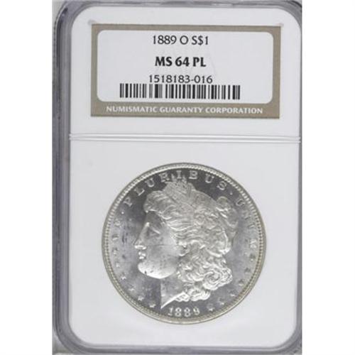 <B>1889-O $1 MS64 Prooflike NGC.</B></I> Nearly fully struck in the centers, which is an unusual attribute for an '89-O, each side is fully brilliant. The fields are deeply mirrored, and heavy frost covers the devices. Borderline DPL quality.<BR><BR><B>Coin Engraver:</B> George T. Morgan<BR><BR><b>Shipping:</b> Coins & Currency (<a target="_blank" href="http://www.heritageauctions.com/common/shipping.php">view shipping information</a>)