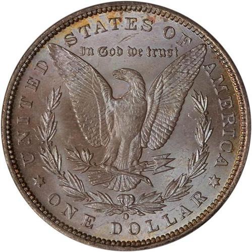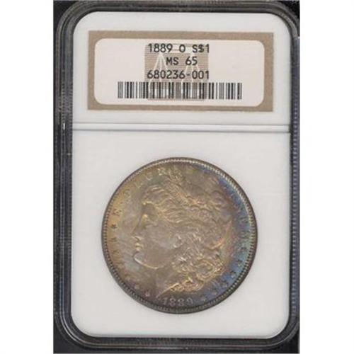 <b>1889-O Morgan Dollar. NGC graded MS65.</b> A few light scuffs in the frost of the eagle's breast. Beautifully toned. Satin surfaces that are almost frosted with pleasant, glowing color. A touch of weakness is seen at centers, but here it is probably that the dies were spaced just far enough apart to prevent stronger metal flow in that area, a characteristic of the O-mint issues of the 1880s and 1890s for some reason <b>(PCGS # 7192)</b>